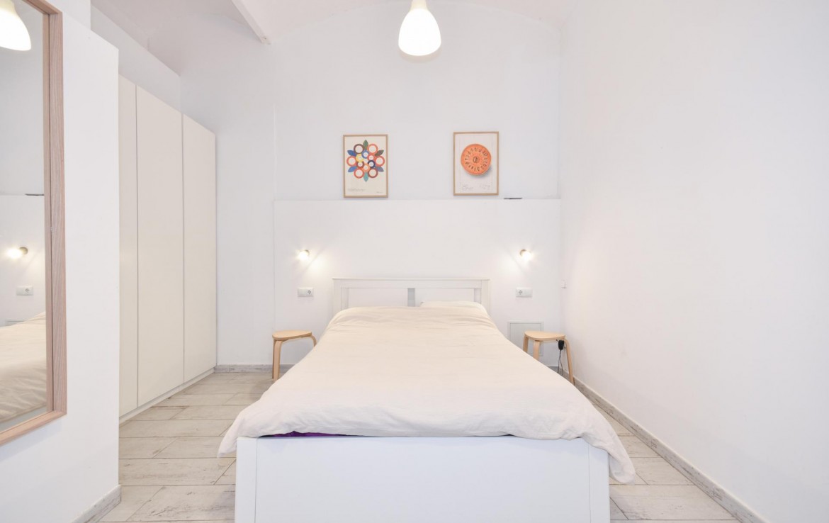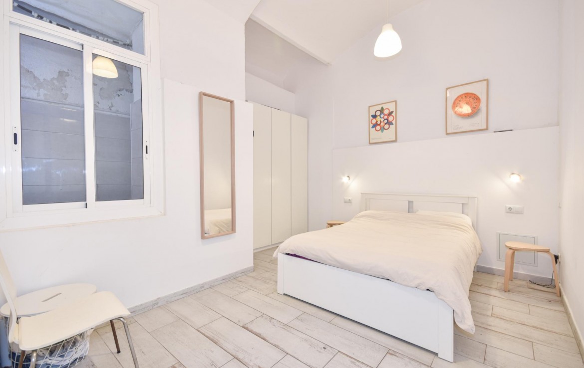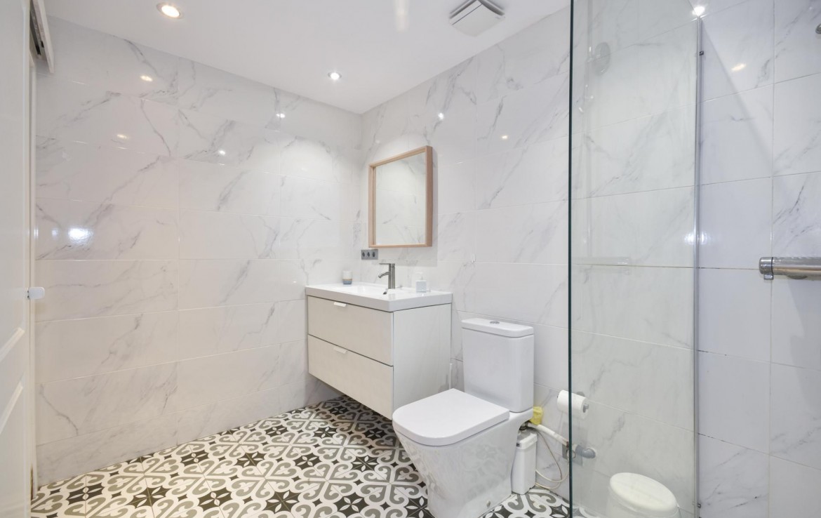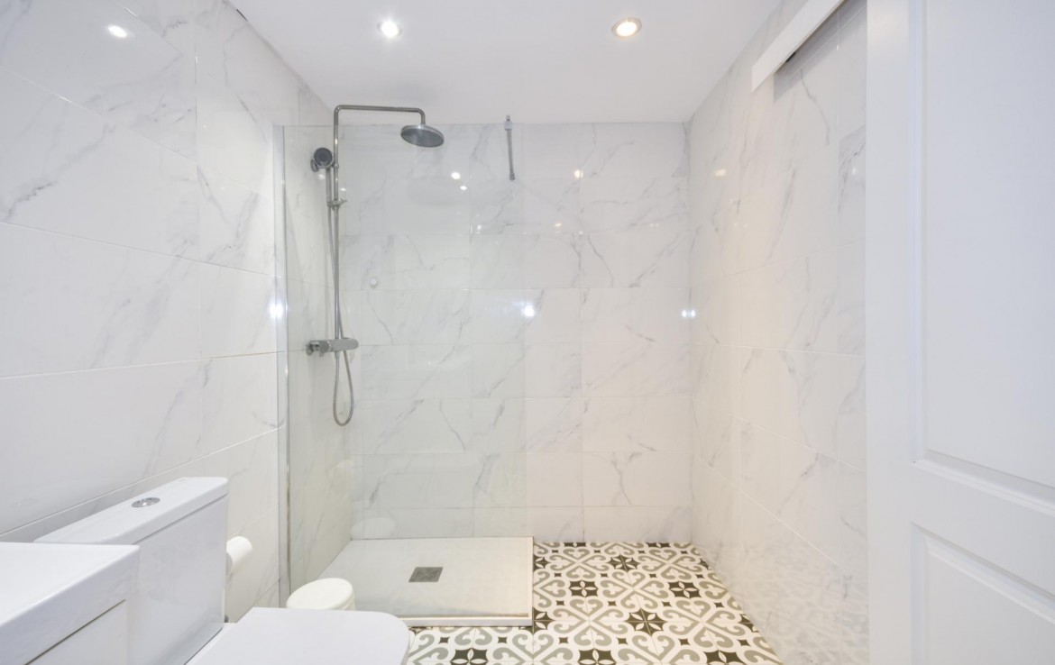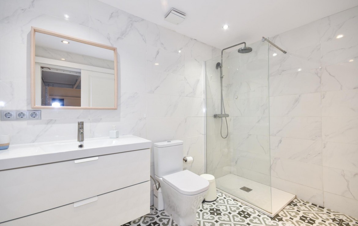 El baño, igualmente espacioso, cuenta con una moderna ducha y acabados de calidad. La reforma ha respetado el carácter original del edificio, pero ha incorporado todas las comodidades modernas, brindando un ambiente cómodo y funcional.