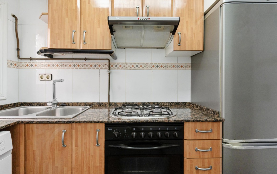 Cocina independiente de buen tamaño y un baño con todas las piezas.